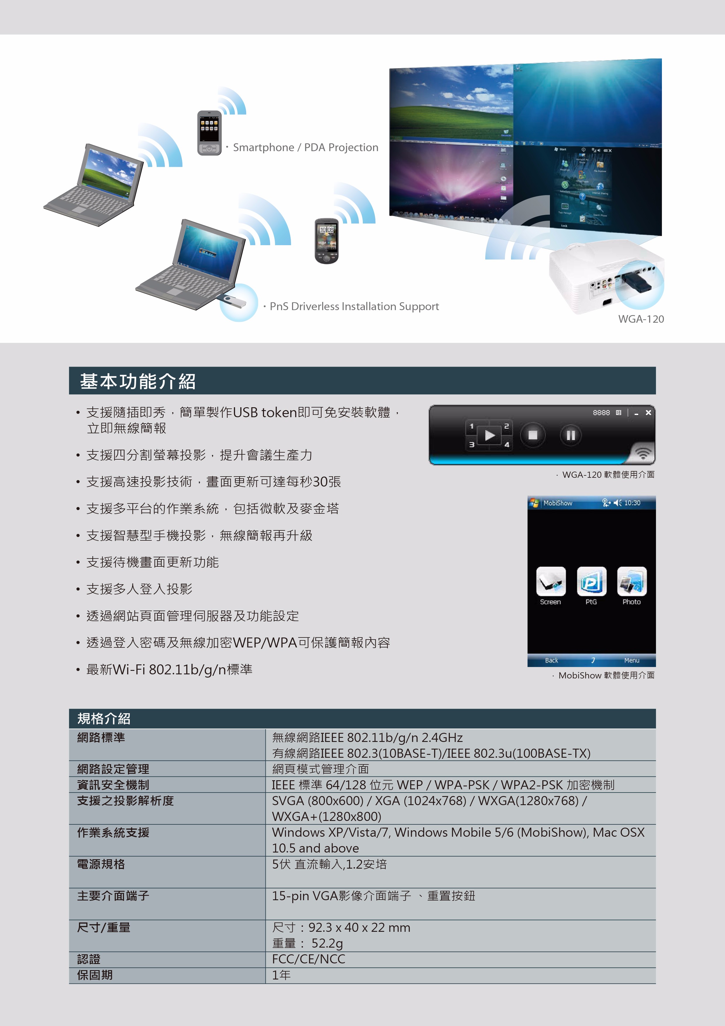 WGA-120 是目前最小型的攜帶式無線投影伺服器,透過它可將各式投影機、螢幕或電視立即升級為無線顯示設備。簡易的安裝流程、幾近同步的投影速度、以及輕巧的外型設計,讓外出簡報變得更方便有趣,從此擺脫VGA線插拔的困擾。