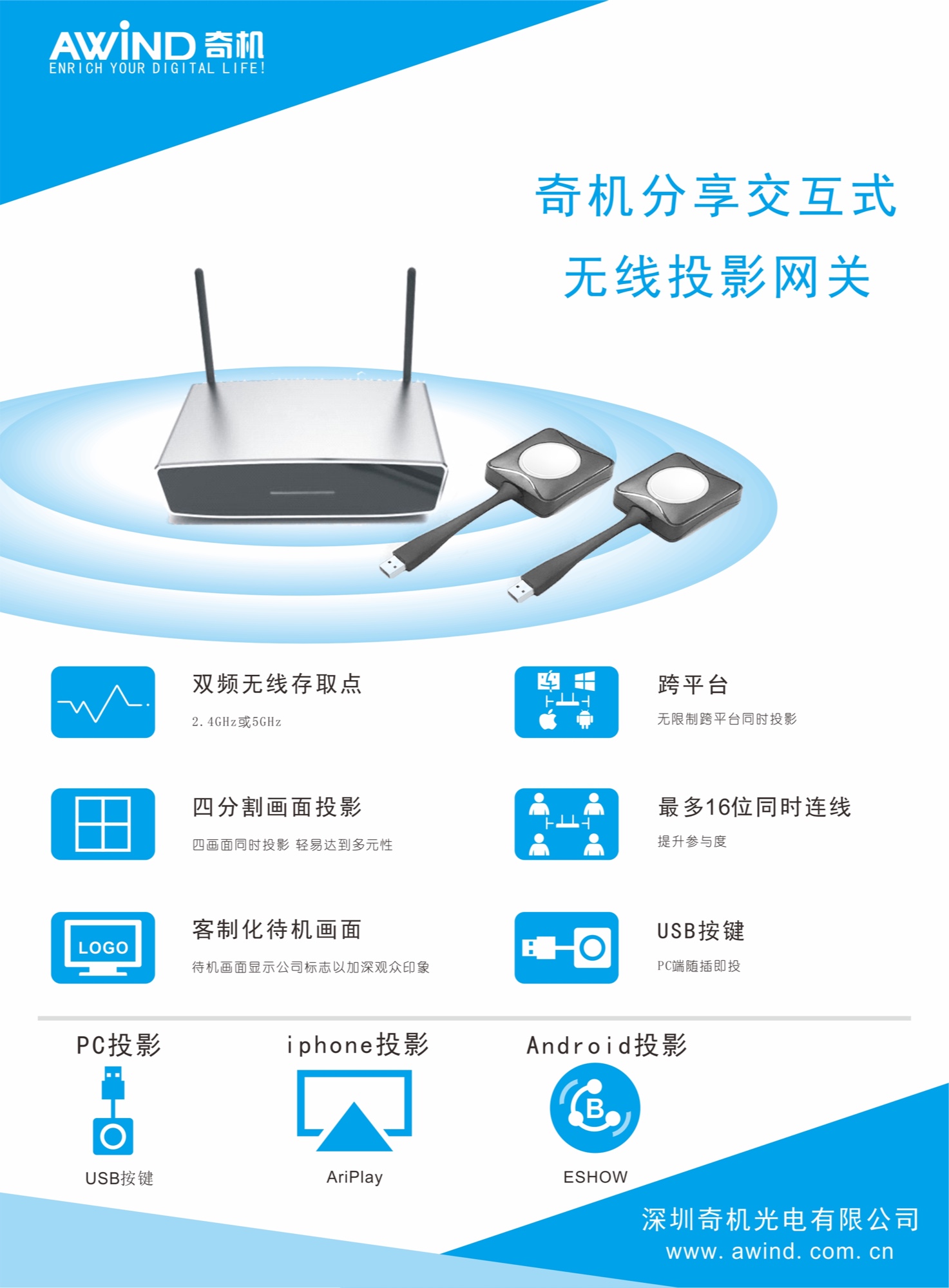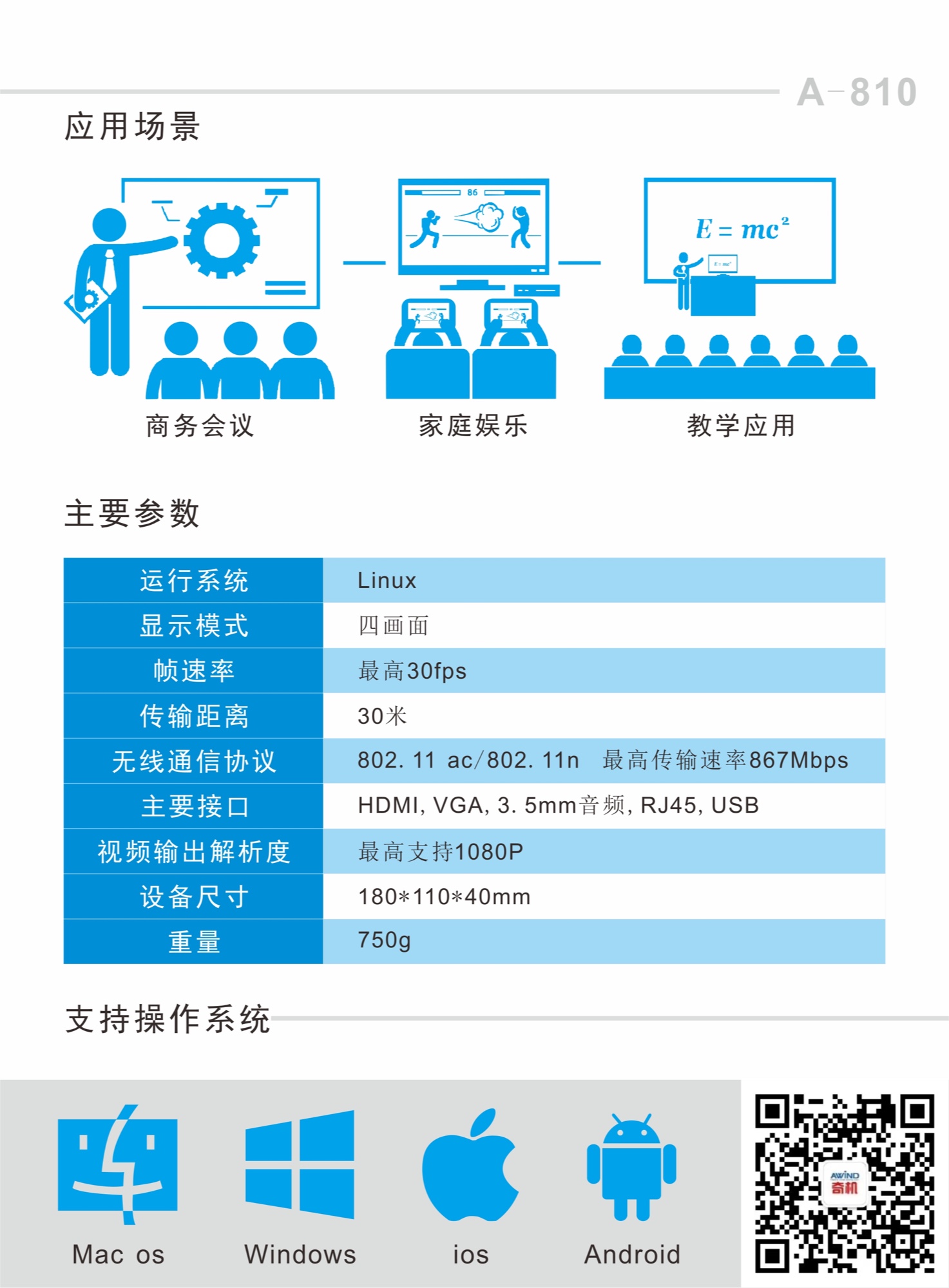 Awind無線投影網關A-810無線會議協作一鍵投影電腦手機無線投屏多屏互動airplay屏幕鏡像同屏器