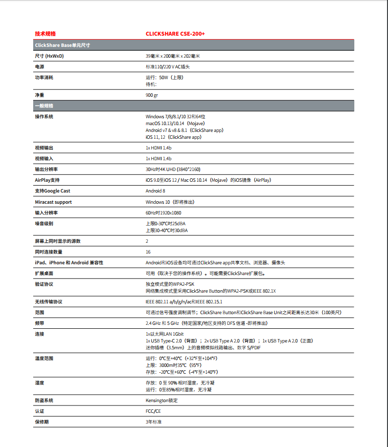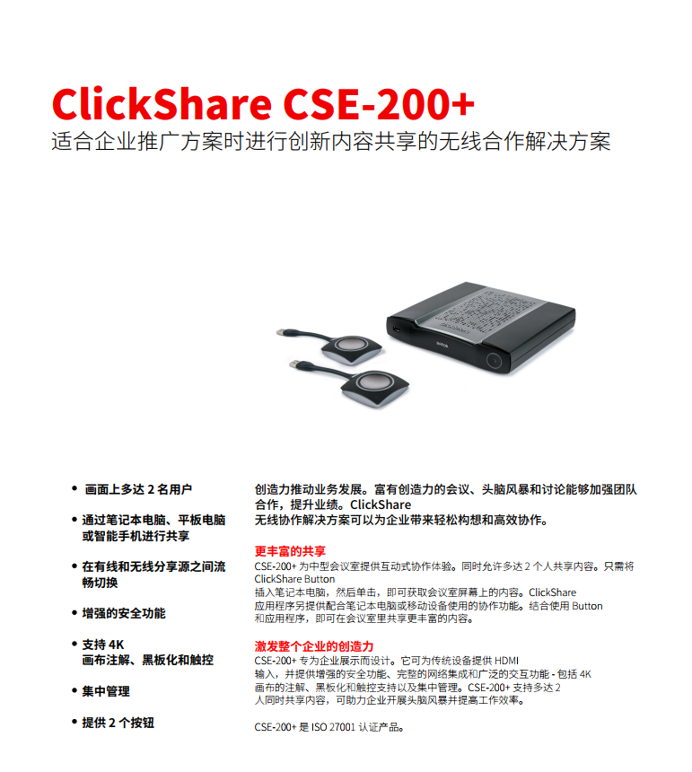 ClickShare無線協作解決方案可以為企業帶來輕松構想和高效協作。更豐富的共享CSE-200+為中型會議室提供