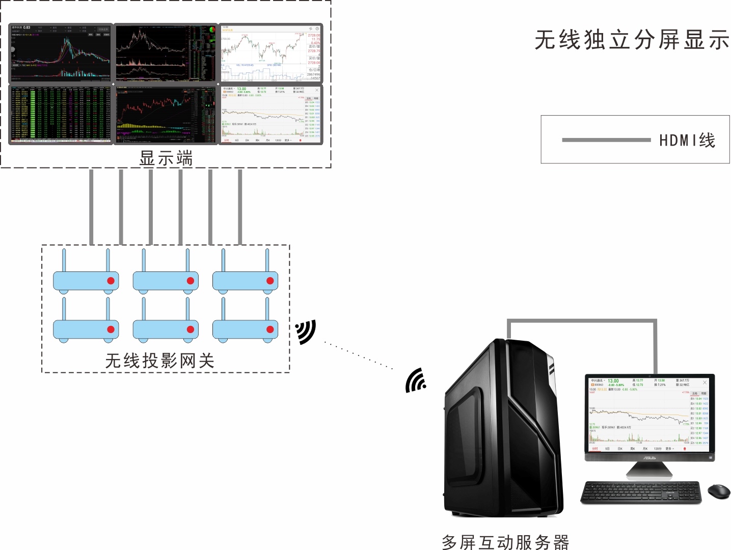 該模式可實(shí)現(xiàn)將多屏服務(wù)器主機(jī)的畫面分別同步顯示在多個(gè)屏幕上。拓?fù)湫Ч缦拢?/span>