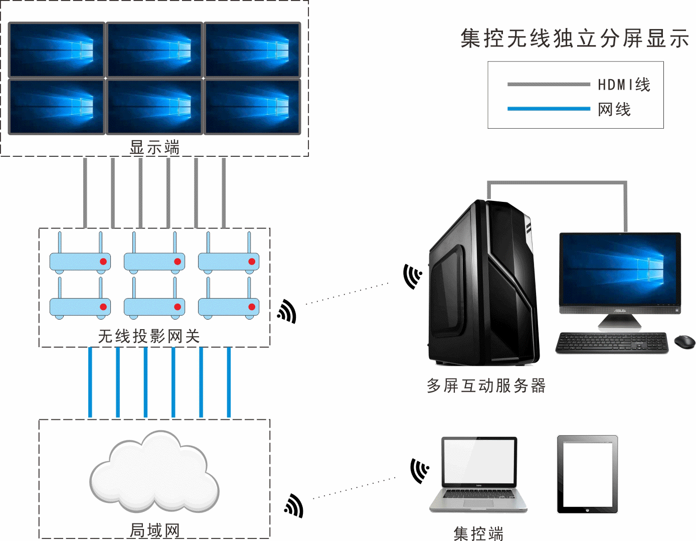 以上三種模式均可使用Awind集控軟件來控制局域網(wǎng)內(nèi)的所有無線投影網(wǎng)關(guān)及每塊大屏的顯示情況。拓?fù)湫Ч缦拢砂醋trl點(diǎn)擊圖片看動(dòng)圖效果):